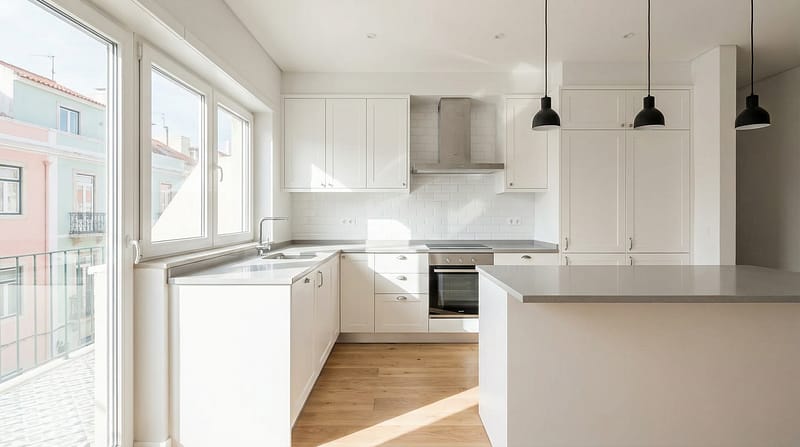 Substituição completa de armários, bancada em pedra, novo pavimento e iluminação LED embutida.